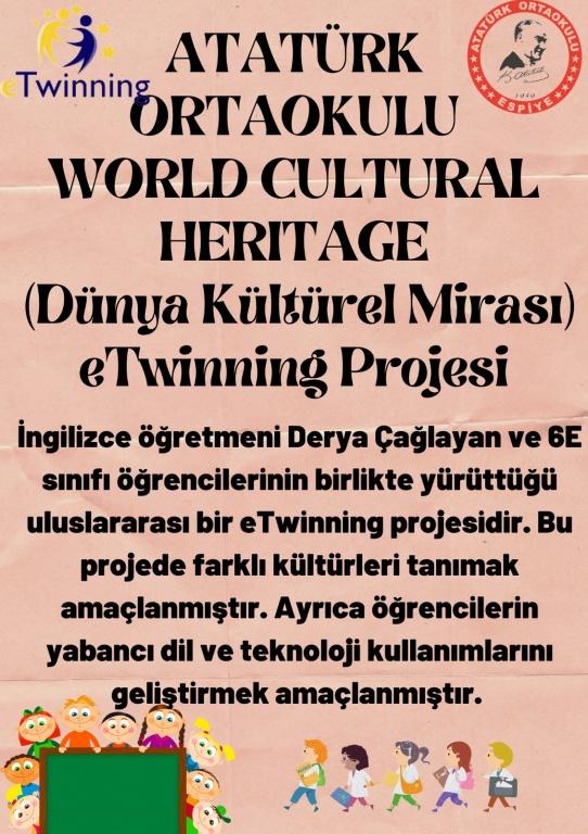 Okulumuz İngilizce Öğretmeni Derya Çağlayan rehberliğinde 6-E Sınıfı öğrencileri ile birlikte Dünya Kültürel Mirası isimli E-Twinning Projesi etkinlikleri gerçekleştirildi. Emeği geçen öğretmen ve öğrencilerimize teşekkür ederiz.